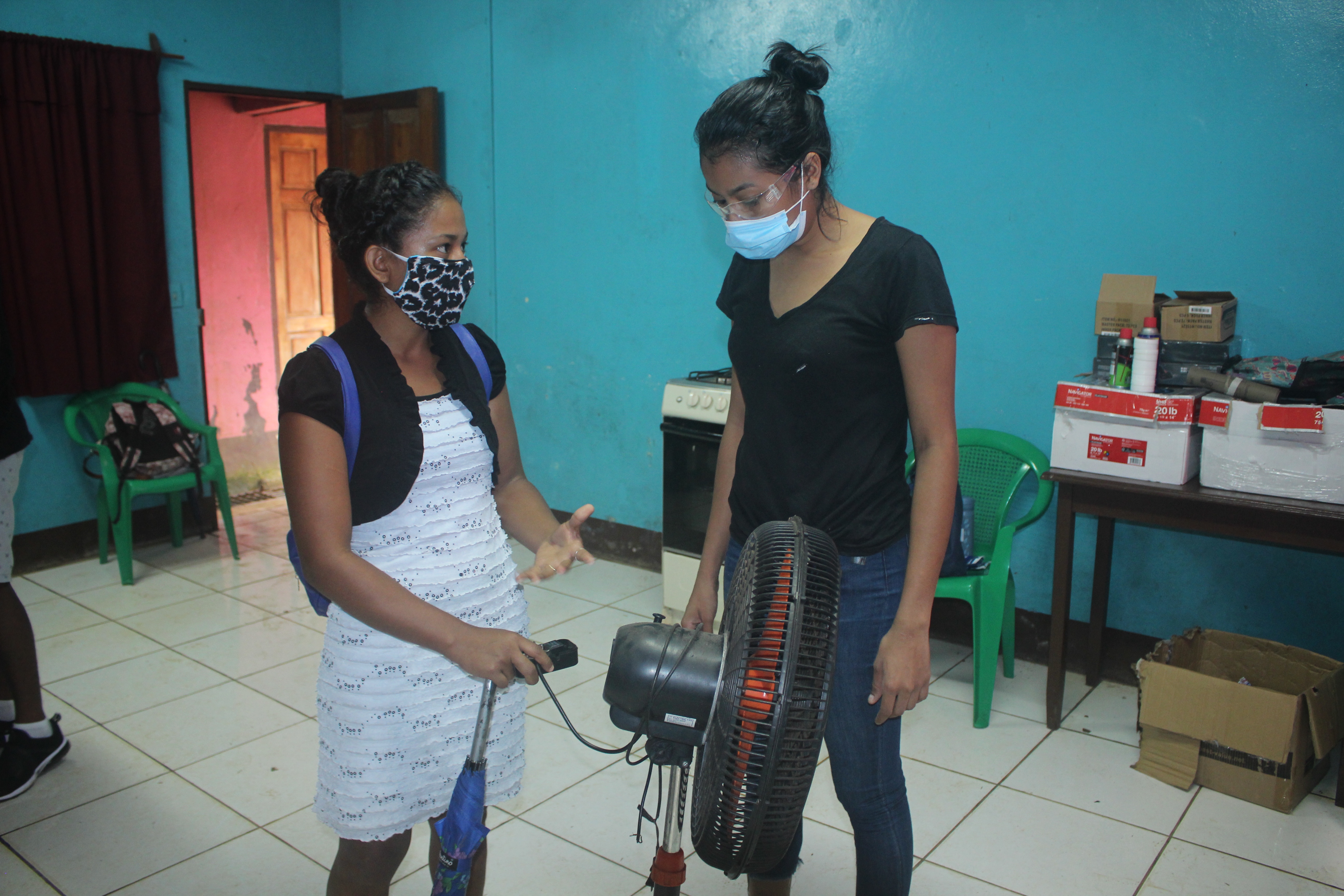 21-year-old Shellyanne Henríquez (right) is originally from Kukra Hill Township and one of the girls participating in the appliance repair and maintenance course. For Shellyanne, “there is no science to repair electrical appliances,” in the photo, she listens very attentively to the resident Lidia Obando explaining the problem with her fan, which luckily only needs a change of the plug cord.